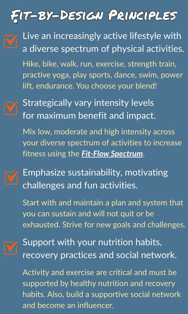 The Fit Flow Spectrum is my take on intensity: Easy (easy walks), Steady (jogs), Push (weights), Power (HIIT), Peak (max efforts). Your plan mixes these zones to match your goals—energy, strength, or performance—keeping it fun and sustainable with activities you love.